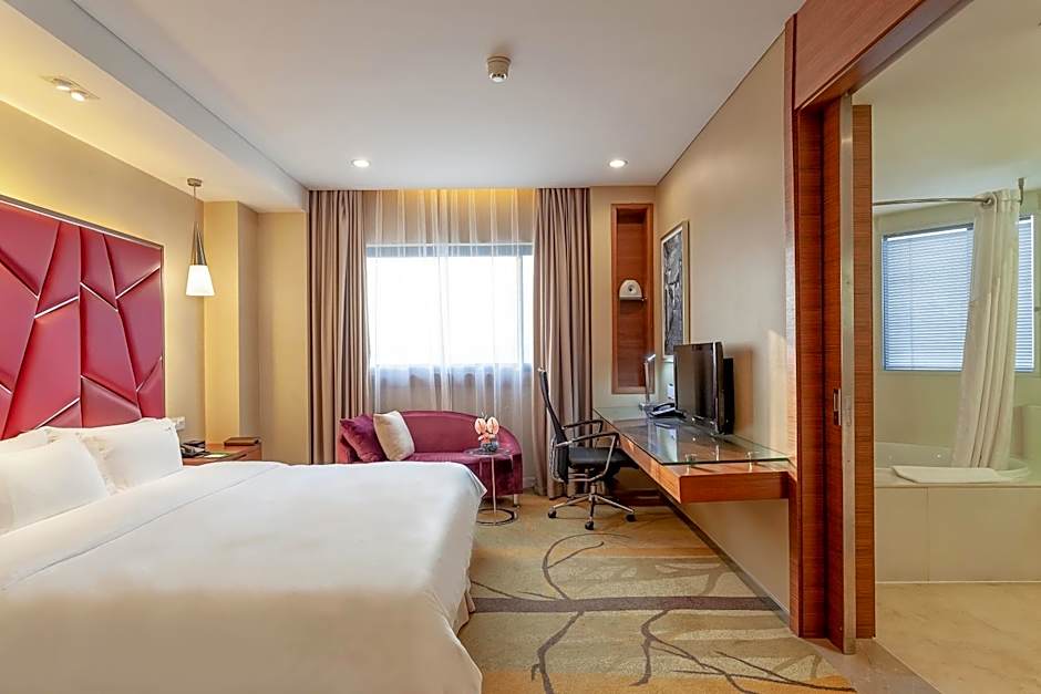 Rooms are equipped with an LCD TV, a mini-bar and safe. The private bathroom has a bathtub and shower.